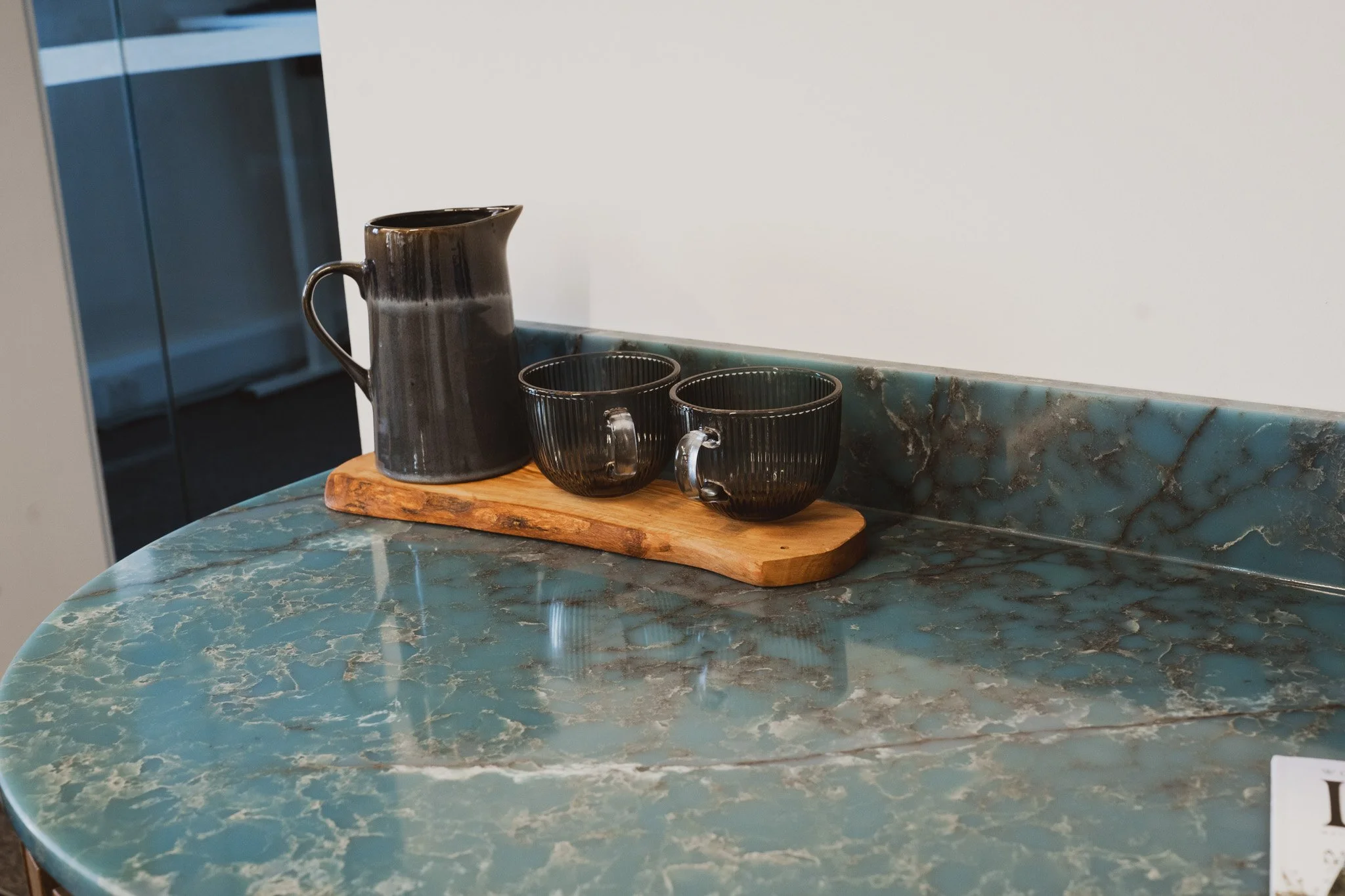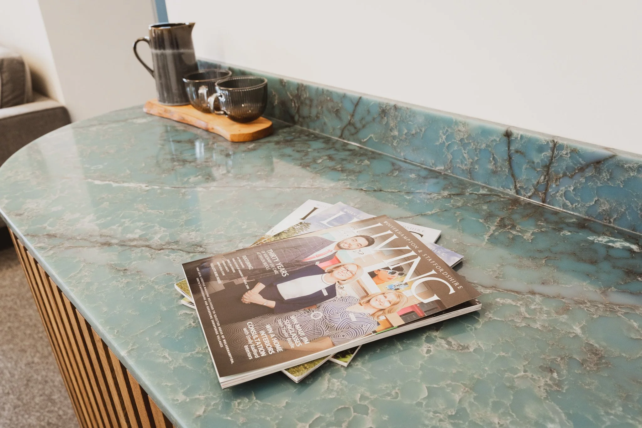 Coordinated bespoke coffee station and coffee table to create a cohesive reception suite