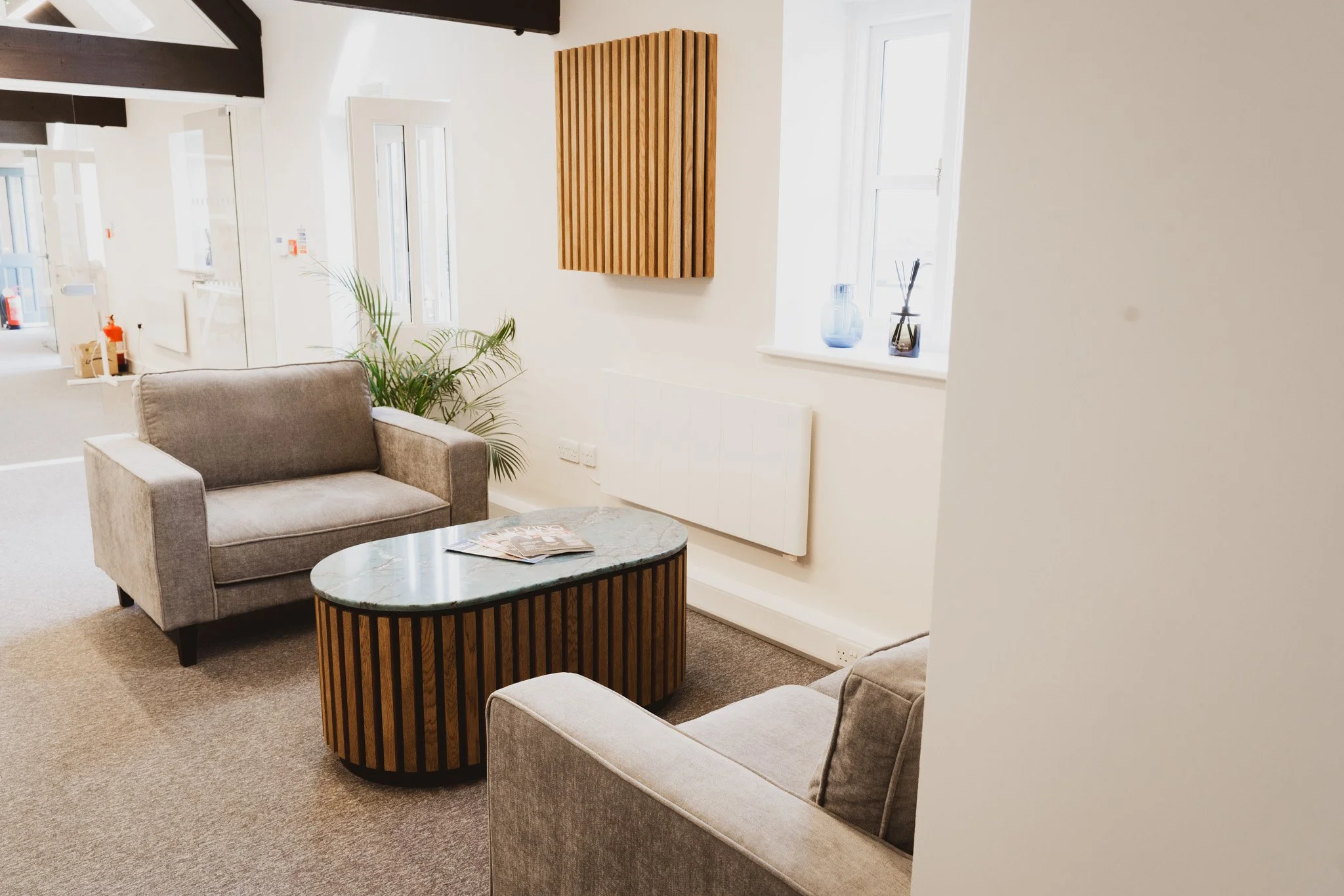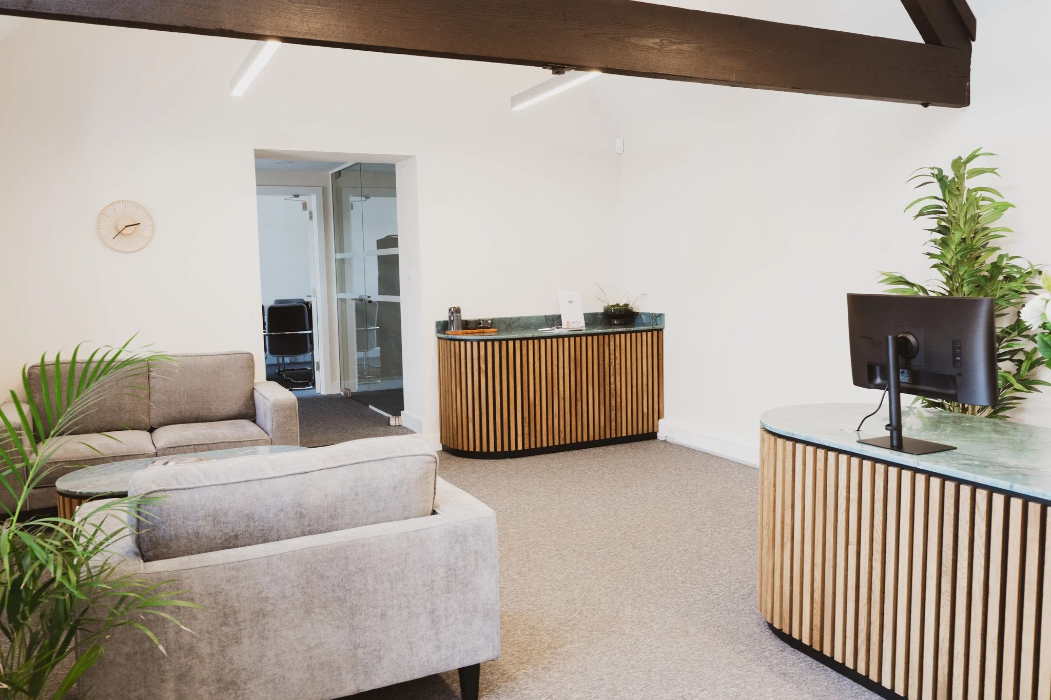 The completed reception provides Abacus Wealth Services with a confident, professional arrival space that enhances the client experience and reflects the quality of the services offered. The bespoke joinery delivers both visual impact and practical performance, creating a lasting first impression for visitors and clients alike.