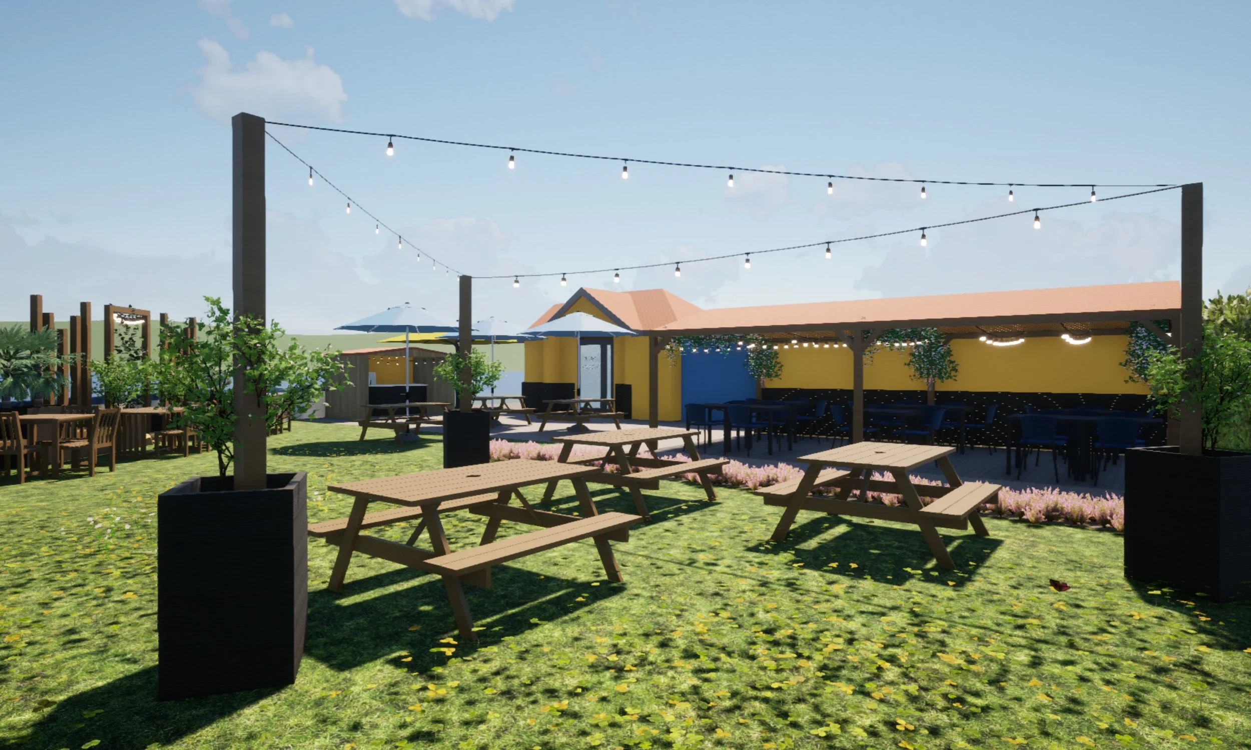 A carefully considered ambient lighting scheme enhances the atmosphere during evening hours, encouraging extended opening times and creating a welcoming glow across the site.